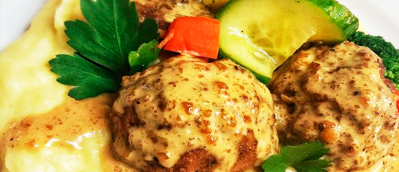 lampaanfilepihvi, täyteläinen konjakki-kermakastike, valkosipuliperunat