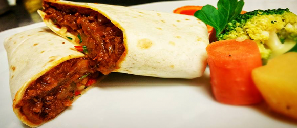 häränsisäfilepihvi, voimakas paprika-, sipuli-, chili-, yrttimaustekastike, valkosipuliperunat
